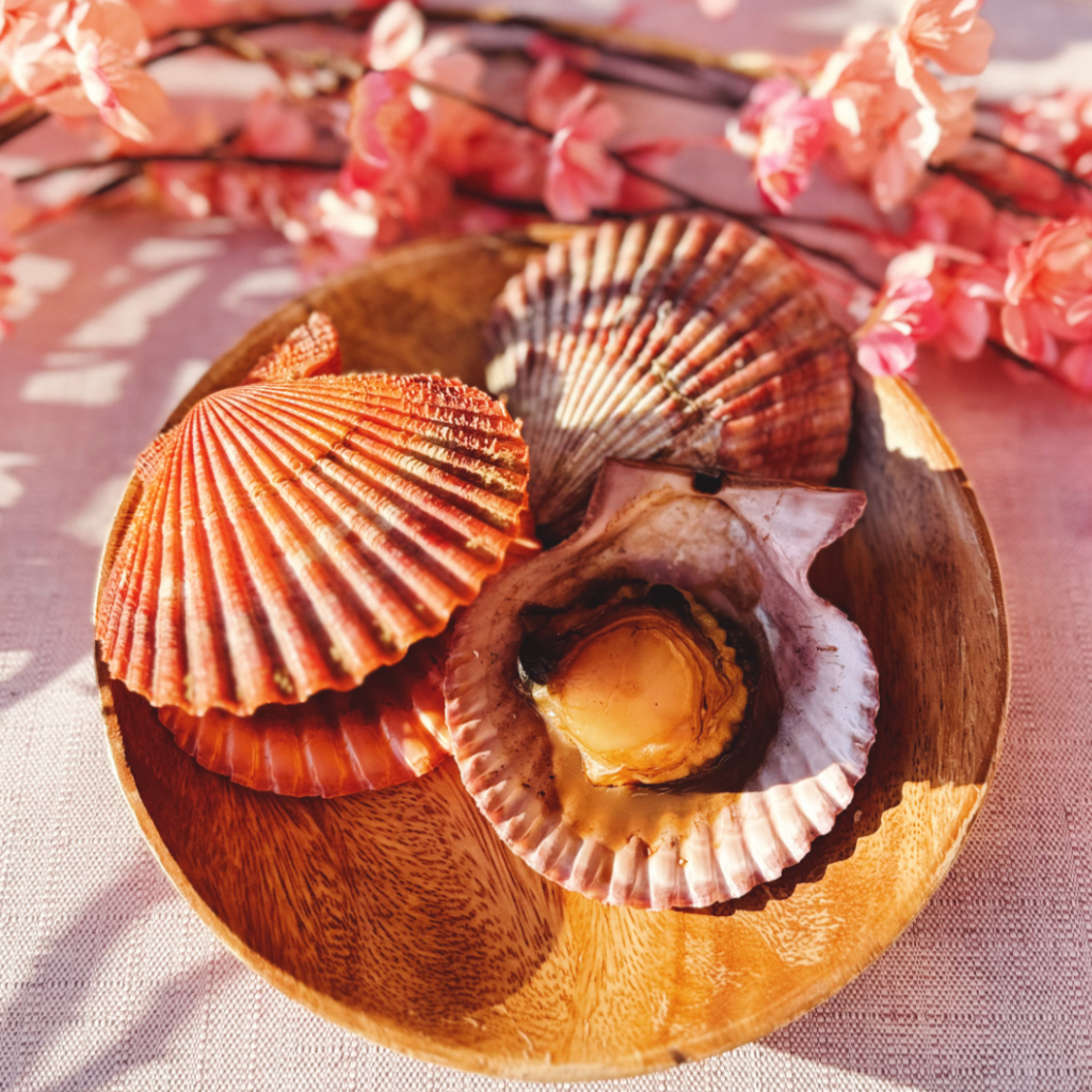 殻付きヒオウギ貝:カラフルな貝殻が美しいヒオウギ貝。濃厚な甘みと旨み、弾力ある食感が楽しめます。